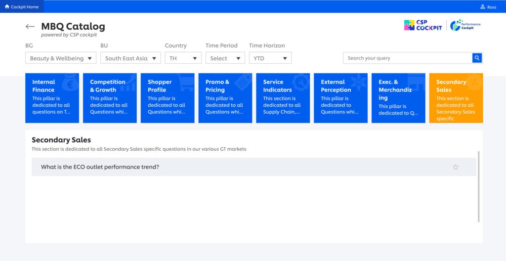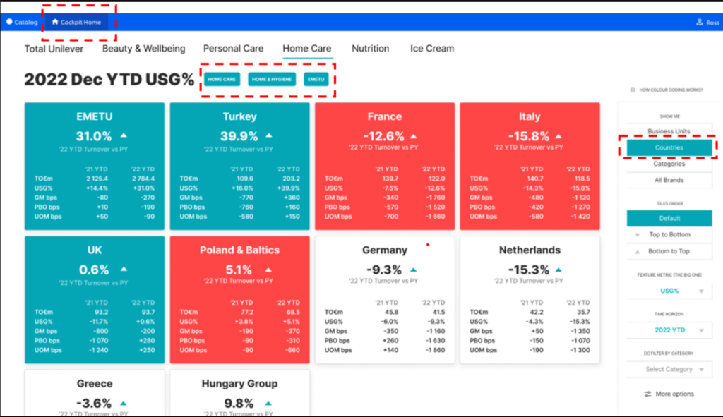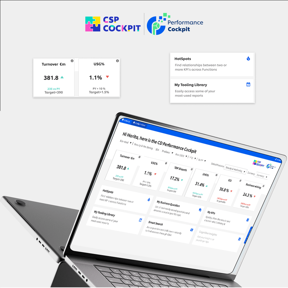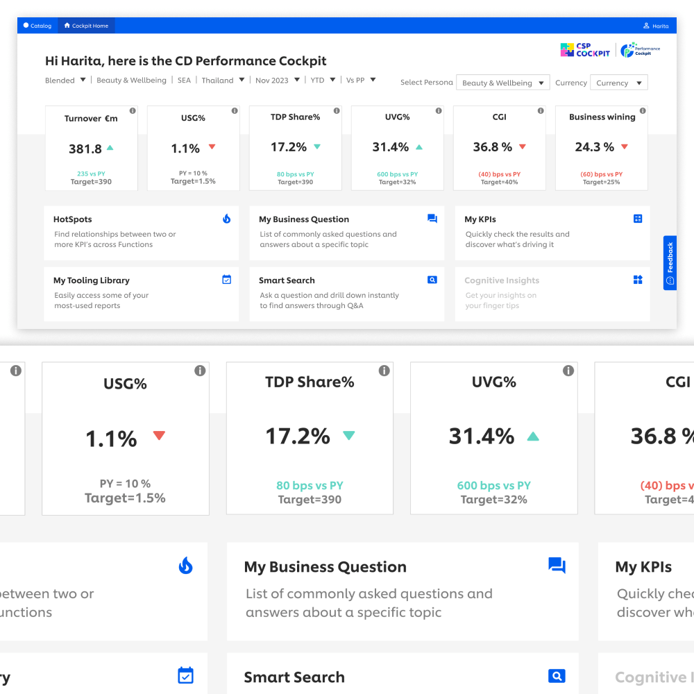 To begin, Camila aims to get a holistic understanding of the performance across different BGs/ markets. Rather than navigating through numerous sources and platforms, she finds simplicity in opening the CD Cockpit dashboard.