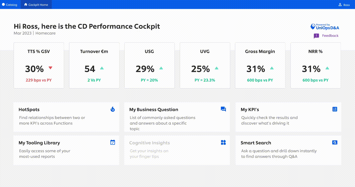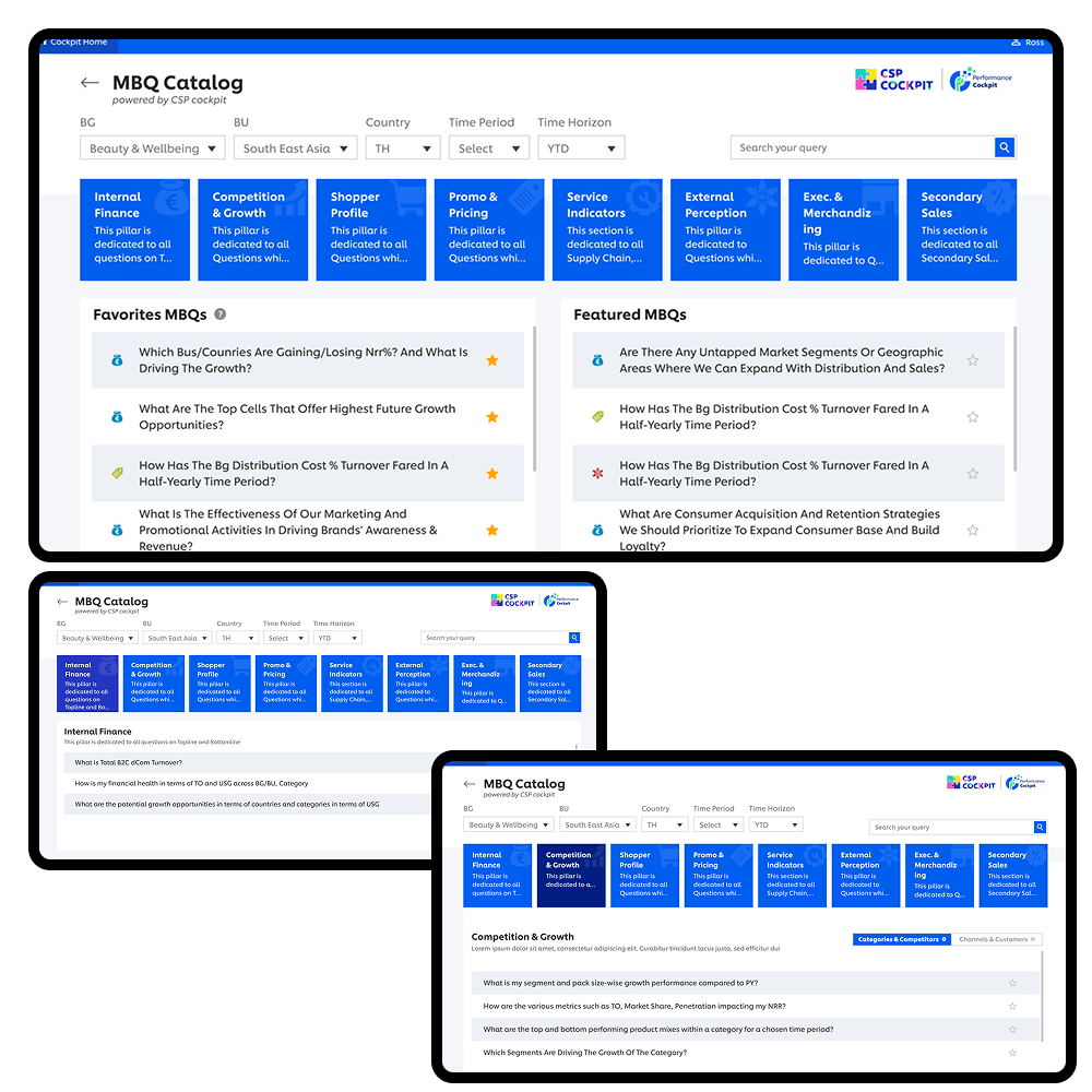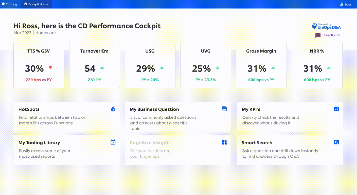 To begin, Camila aims to get a holistic understanding of the performance across different BGs/ markets. Rather than navigating through numerous sources and platforms, she finds simplicity in opening the CD Cockpit dashboard.