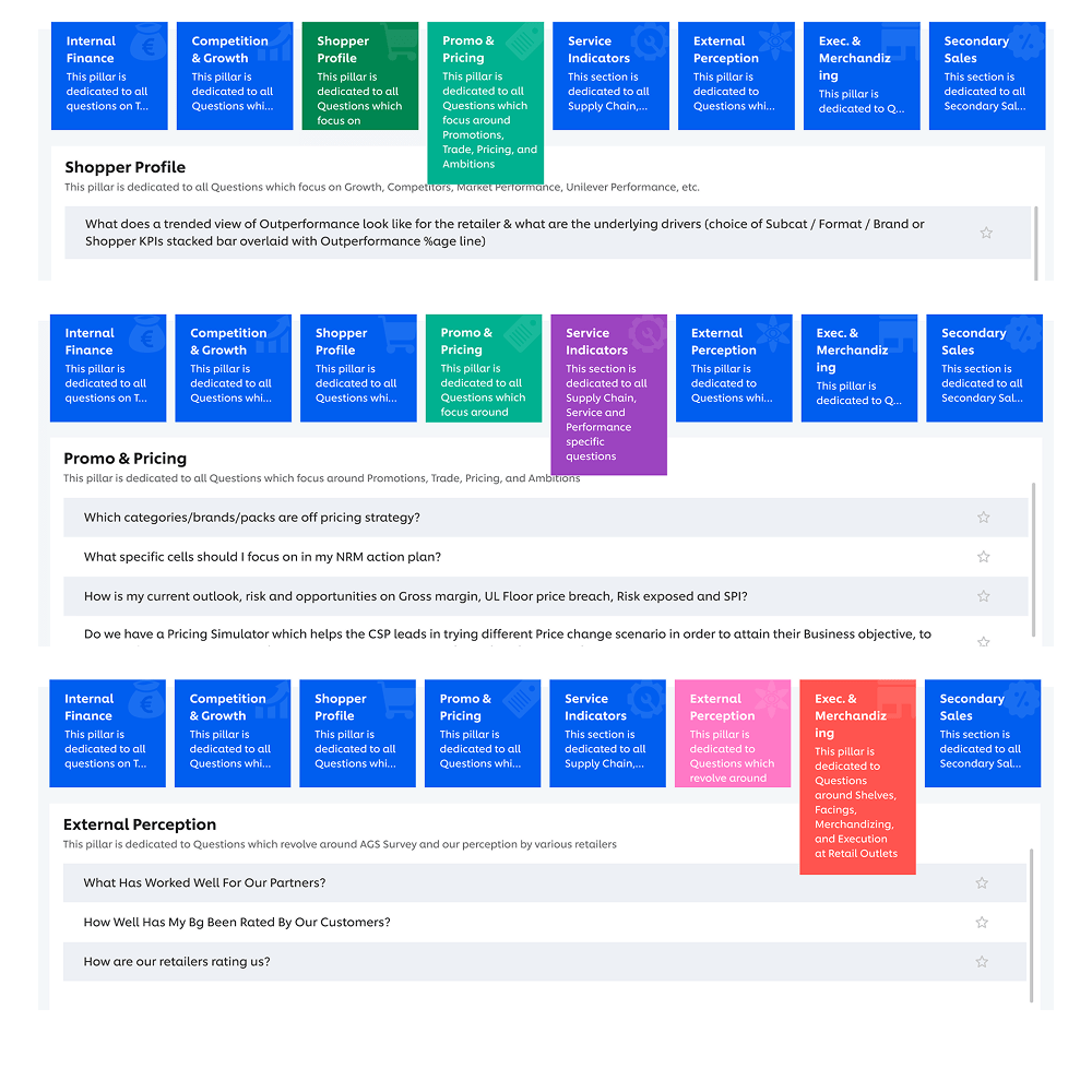 MBQ page presents her a thoughtfully curated inventory of business questions, designed to assist businesses in solving their day-to-day challenges. By selecting any given question, she can access an infographic dashboard, sourced from an existing capability.
