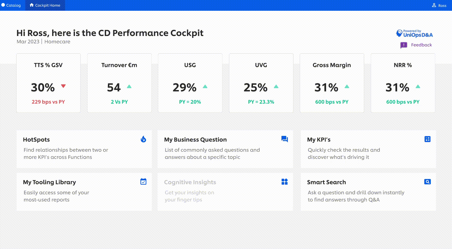 For instance, as shown in the video, she finds a red downtick in the Turnover card. This indicates that compared to today, ‘Home Care’ in ‘Europe’ was doing better in terms of turnover around this time in the previous year. She can easily navigate to the KPI of interest by clicking on its card.